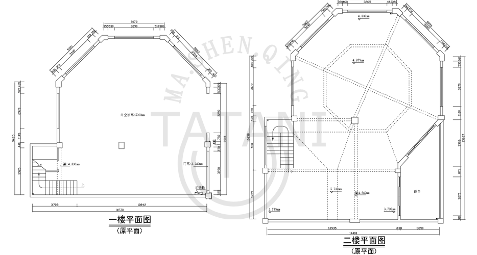 | 某地級(jí)縣的特色餐飲:地址在多家KTV附近,人流可以說很多,下午7點(diǎn)量完房,半夜十二點(diǎn),就說第二天早上就要看設(shè)計(jì),我下午才給到平面圖給他們;下面是原平面圖,樓梯為角鐵木板結(jié)構(gòu);八角窗左后斜窗正對(duì)某客當(dāng)時(shí)流最好的KTV,左上窗正對(duì)另一家大型KTV,前方為主干道,左上方停車也方便,車位多,位置相當(dāng)好;不過租金也相當(dāng)貴; |