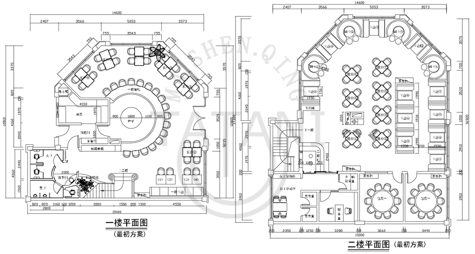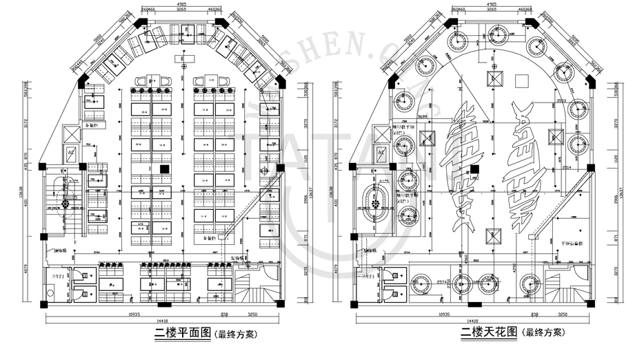 | 下面是二樓的最終方案,但最后還取消了卡座和屏風(fēng);全是純開放式餐臺(tái),但這類的成功案例是大型超市;最終經(jīng)營(yíng)時(shí)間,最后改為:17:30-02:00;因?yàn)橹髁鞯目腿,就是出來唱K的,出來玩的,出來泡妞的,在KTV里吵了一夜,更喜歡靜一點(diǎn)的地方;更希望有個(gè)私密點(diǎn)的空間,但沒有人給他們提供這個(gè),而這里也沒有半島類的餐館; |