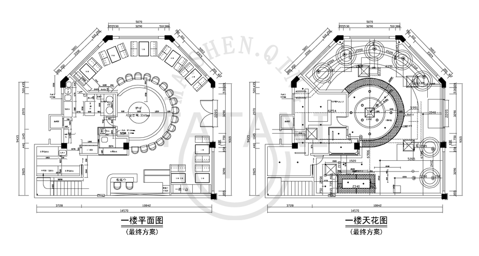 | 但最終方案:完全以城市連鎖店的作為主要參考,并增添了老板自己的意思,還他風(fēng)水師的意見(門的尺寸,用廣州尺,后面不可以開門等,風(fēng)水上在某些情況下是不好,但餐飲風(fēng)水上沒后門是不行的;因?yàn)槠溜L(fēng)是“爐子和吧臺(tái)”,大進(jìn)小出本是正常的;最終垃圾菜品貨都是由前面進(jìn)前門出,剩菜另設(shè)了通道;),及老板在各國(guó)的見識(shí);我馬上成了土包子,談風(fēng)水論釣網(wǎng),他又有自己的風(fēng)水師,因?yàn)樽饨鸶,時(shí)間又緊我只能將就他們,從他的角度上去設(shè)計(jì),二樓他取消的屏風(fēng),和包房、也不給充電插座,老板的理由是多人在一起才熱鬧,沒有插座,人才不會(huì)賴在這里,學(xué)設(shè)計(jì)時(shí)老師也提到過這一點(diǎn),客賴著是會(huì)少用很多生意;所以我只針對(duì)快餐業(yè)用過這個(gè),而且還是用在桌子上,但效果并不好;但用經(jīng)營(yíng)者的角度,廚師請(qǐng)來的五六個(gè)小工、甚到剛來的學(xué)徒,都給到5000以上工資,(5000是我做設(shè)計(jì)十年以后才拿到的底工資),服務(wù)員也3000以上,我沒再說話,也許他是對(duì)的,可能我是落伍了;除此之外還取消的門口的雨蓬,外觀設(shè)計(jì)也完全沒理會(huì)我的意見,交給了他親戚做廣告的,意思是可以讓他掙點(diǎn)錢;這一點(diǎn)以前在大公司做小弟,要辭職的時(shí)候,香港老大曾對(duì)我說過:“你要記住,設(shè)計(jì)的成功與否,不在于你的能力,而是在于設(shè)計(jì)的收費(fèi),如果你的設(shè)計(jì)費(fèi),在對(duì)方心目中不算錢,或者你不要錢,你的設(shè)計(jì),永遠(yuǎn)不會(huì)得到認(rèn)可和實(shí)施,還有你的建議永遠(yuǎn)不會(huì)得到重視,包括你的人;”這一點(diǎn)這么多年以來我深深得到體會(huì);下面是一樓最后的設(shè)計(jì), |