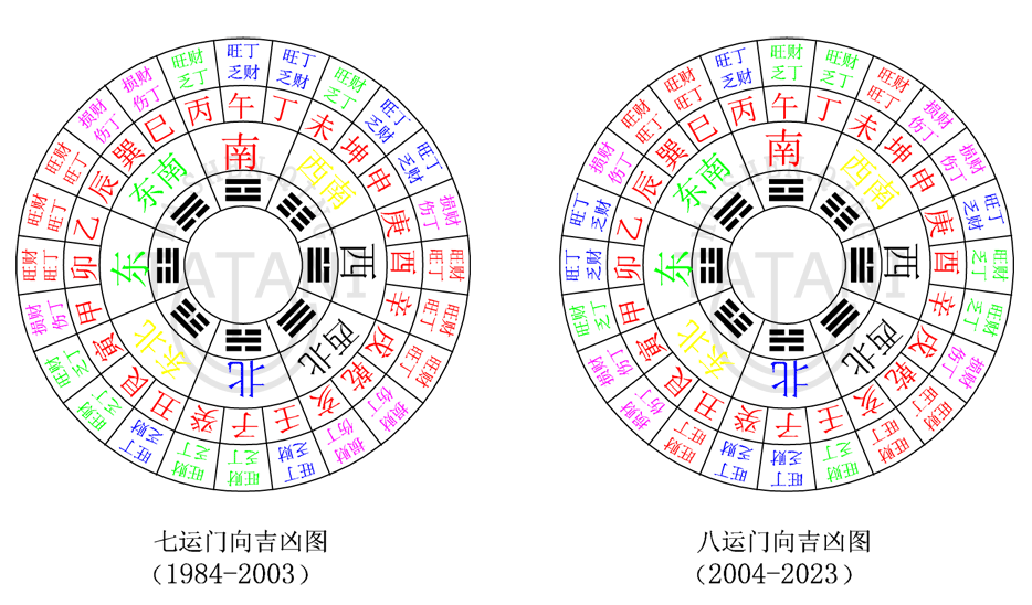 因為學(xué)習(xí)風(fēng)水知識面上方向不一樣,也就是我們說的所謂‘派別’的不一樣,關(guān)于多少元多少運,有兩種如‘三元九運’以‘甲年立春’開頭,每運20年,9運共180年;和‘二元八運’兩種,二元八運,以陽爻‘—’9年,陰爻‘--’6年去算,同樣是180年,都是用文王八卦(后天), 下面是三元九運最近的前七、和現(xiàn)在八運門向吉兇圖; |