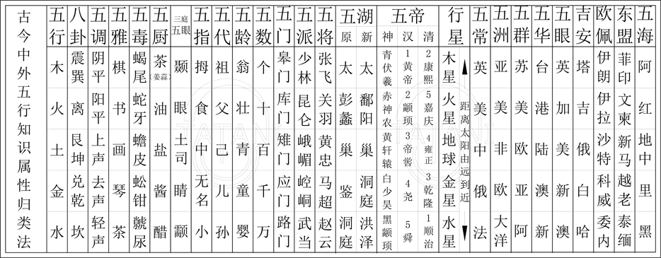 如:1、九大行星:我們也是按這五行的順序命名的,以太陽為根據(jù):由遠(yuǎn)到那近,分別是冥王星(被除名)、海王星、天王星、土星,木星、火星、地球、金星、水星、(如果只算五個(gè)的話)順序就和五行一樣了,多出來的是海天陸(土)所以個(gè)人覺得,冥王星(迷信)沒了,土星可以改名地王星;正好三皇五帝,開玩笑的; 2、五大常任理事國:1英國(草頭)木,央曾統(tǒng)領(lǐng)過世界;2美國(火)拆羊大,形像火,英生美;3中國C位、中為土,曾為世界中心;4俄國:人我為義,義講的是金;5法國:(水旁)水,土也是中,但不落地,差點(diǎn)統(tǒng)領(lǐng)過世界; 3、五眼:英(木)、加(添火)、美(實(shí)際中心,拆字:王大生角--魔王)、新西蘭(斤同金,西也是金)、澳(水邊); 4、吉安組織:1塔土旁但實(shí)力不夠,退為草頭,所以不聽話;2吉為士口,與火沒太大關(guān)系,但所不理事,3俄為中心(主義、主拼)4白(金)5哈口旁(為水)、6亞美尼亞太。ㄒ彩秋w地,所以不算;)所以集安結(jié)織很難行動一致。 5、五華:臺(藍(lán)轉(zhuǎn)綠)、香港(簡稱港)、陸(中)、澳、缺一,五行不全,所以并不穩(wěn)定;現(xiàn)新加入海南,成四海,五行:1木(香港)2火(海南)3土(大陸)、4金(臺金不明顯,只要化金,或者以釣魚臺;白色政黨上臺,金配屬姓名的領(lǐng)導(dǎo)人,就很容易回歸)、5水(澳門); 6、東盟主不配位更亂、歐配克沙特,好一點(diǎn)只有他配主位:五海中阿拉伯就位海不明顯,如果修正去阿拉伯海,換為波斯灣,那黑;虿ㄋ篂尘蜁环(wěn)定;