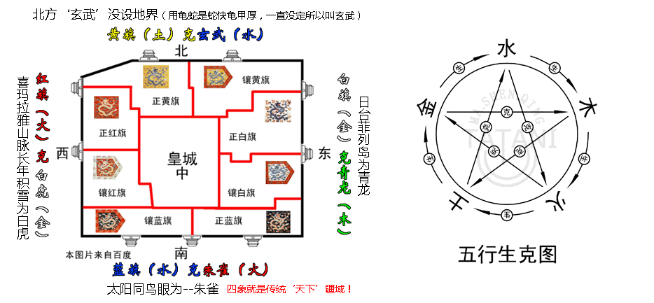 大清,原名‘大金’只是個(gè)萬來人的小部族,但曾兩次快速統(tǒng)治天下,為什么說兩次,因?yàn)樗未u(yù)上是大金的‘屬國’,以進(jìn)貢才可以自保;另外一次就是大清朝;宋代大金非常強(qiáng)大,金五行上是‘金’,源起于遼國,前‘遼’五行為火,形同擺舟(木),五行不純,金反遼,由由底下鑿舟而起,遼為大金所滅;除了大金,還有個(gè)西夏國(西屬金,夏為火),金可和金,火可克金,所以大金打不下西夏;但西夏是前金后火,與大金和為主;‘宋’五行為金木,上金下木,金虛木實(shí),名譽(yù)上屬國合情理;宋五行以木為主,而非金,金克木,宋為劣勢,但強(qiáng)大的大金滅不了宋,主要決戰(zhàn)點(diǎn)是水,變成了金生水,水生木,形成旺宋之局;這里我說一下題外話,宋朝‘最強(qiáng)大’的將軍,只是個(gè)文人,名字叫虞允文,而不是北宋楊繼業(yè)、南宋岳飛,是虞允文以水耗金,以極少數(shù)的軍隊(duì),打敗了大金百萬大軍,才保住了南宋; 為什么‘大金’改國號‘大清’,主要是因?yàn)榇竺,大明很重視風(fēng)水,而‘明’為日、月,代表天地陰陽,在風(fēng)水學(xué)上有著無可取代的含義,前火可克金;同樣大金開始重視玄學(xué),并一度發(fā)展到了不可收拾,剃頭用的是面相學(xué)識,皇帝改名皇太極,軍隊(duì)使用五行旗,只有四色,卻分八旗,為什么叫五行旗呢?因?yàn)檫@里沒有用八卦學(xué)識,也不是他們不會八卦,因?yàn)榘素詫W(xué)識他們用的非常多!但他的八旗除了八字,并沒有用任何八卦知識; 作為軍隊(duì),八旗主要是用五行克的原理,在這我們先講講,方位五行,東木、南火、中土、西金、北水;如黃旗(土)攻守的方向是北方,以黃旗(含衣甲)的土克北向的水;以藍(lán)旗的水克南向的火,以白旗克東向的木,以紅旗克西向的金;沒有綠旗是因?yàn)榫G為木克中間土,也就是克自己,而正、鑲應(yīng)該只是地位的問題;鑲旗主要加了紅色,因?yàn)榧t為火,生中間的土,鑲紅旗加了白色,主要是紅旗本生土,中土生白金算是回報(bào)它; 關(guān)于顏色的五行知識,我們旗色來講講歷史,以下當(dāng)我瞎說, 中國第一面本義上的國旗,清黃龍旗, |