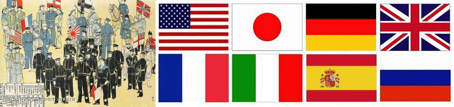 | 八國聯(lián)軍:美、日、德、英、法、奧、意、俄、澳、印等國軍隊(duì),下面說說日本旗, | |||||||||