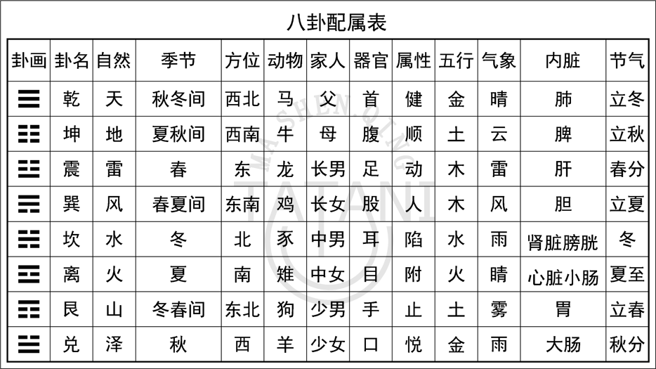八卦 《大游年歌》(這個(gè)千萬別死記,是寫復(fù)雜、弄亂順序用來顯示高深的騙人的,記‘游年六字訣’可以了,除非你喜歡唱這類歌;),《大游年歌》如下: 乾:六天五禍絕延生 坤:天延絕生禍五六 震:延生禍絕五天六 巽:天五六禍生絕延 坎:五天生延絕禍六 離:六五絕延禍生天 艮:六絕禍生延天五 兌:生禍延絕六五天 八卦 游年六字訣:“生絕禍,五六天;” 全句是:‘伏生絕禍,延五六天;’但沒有人這樣讀,原口訣的解釋是:兩卦不變是伏位(伏位)都是那個(gè)位置,可以不理;上變生氣,中變絕命,下變禍害;全變延年(全變不用記);后句:上中變五鬼,上下變六煞,中下變天醫(yī); 口訣如何用:下面給你舉個(gè)例子,這樣你就明白上圖的吉兇位置,是如何算出來了;算這個(gè)要用后天(文王)八卦,例如坐北朝南,北方是“伏位”,也是坎位,卦畫中“斷”為陰爻,后面以“0”代替;“連”為陽爻,后面以“1”代替;卦畫是010,東邊是震位001,與坎卦放到一起,第一個(gè)都是0,第二、第三變了,轉(zhuǎn)過來就是中下變了,是“天醫(yī)”;西面為兌卦卦畫是011,與坎卦010,最后一條變了,西面是“禍害”;東北為乾卦111,與坎卦010,變了第一和第三條,此位是“六煞”! |