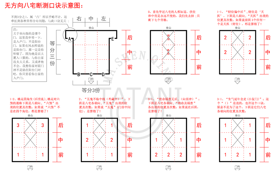 | 無方向八宅斷測歌訣:“財(cái)位布中后,四角桃花生(后宮亂);五鬼不臨中門(喜藏中);絕命禍害無后(向前沖);” | |||||||||